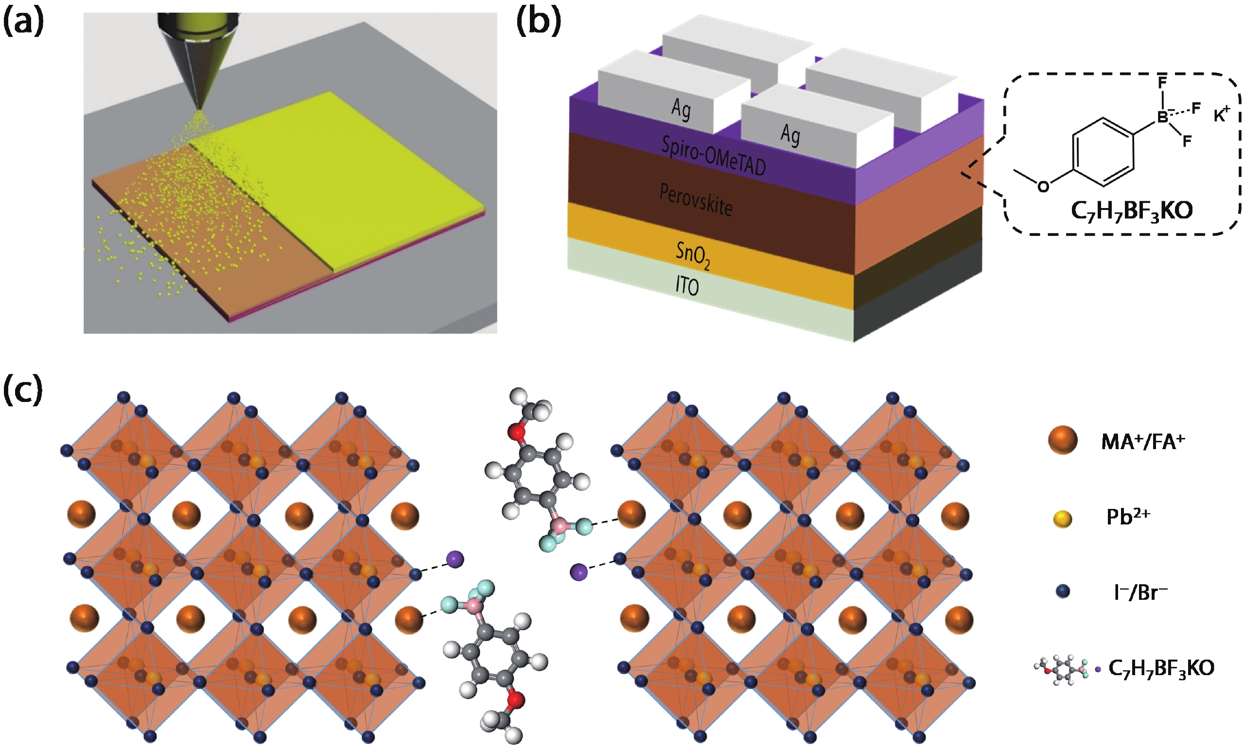 Abstract: Defects as non-radiative recombination centers hinder the further efficiency improvements of perovskite solar cells (PSCs). Additive engineering has been demonstrated to be an effective method for defect passivation in perovskite films. Here, we employed (4-methoxyphenyl) potassium trifluoroborate (C7H7BF3KO) with ${{\rm{BF}}_3^-}$ and K+ functional groups to passivate spray-coated (FAPbI3)x(MAPbBr3)1–x perovskite and eliminate hysteresis. It is shown that the F of ${{\rm{BF}}_3^-}$ can form hydrogen bonds with the H atom in the amino group of MA+/FA+ ions of perovskite, thus reducing the generation of MA+/FA+ vacancies and improving device efficiency. Meanwhile, K+ and reduced MA+/FA+ vacancies can inhibit ion migration, thereby eliminating hysteresis. With the aid of C7H7BF3KO, we obtained hysteresis-free PSCs with the maximum efficiency of 19.5% by spray-coating in air. Our work demonstrates that additive engineering is promising to improve the performance of spray-coated PSCs.