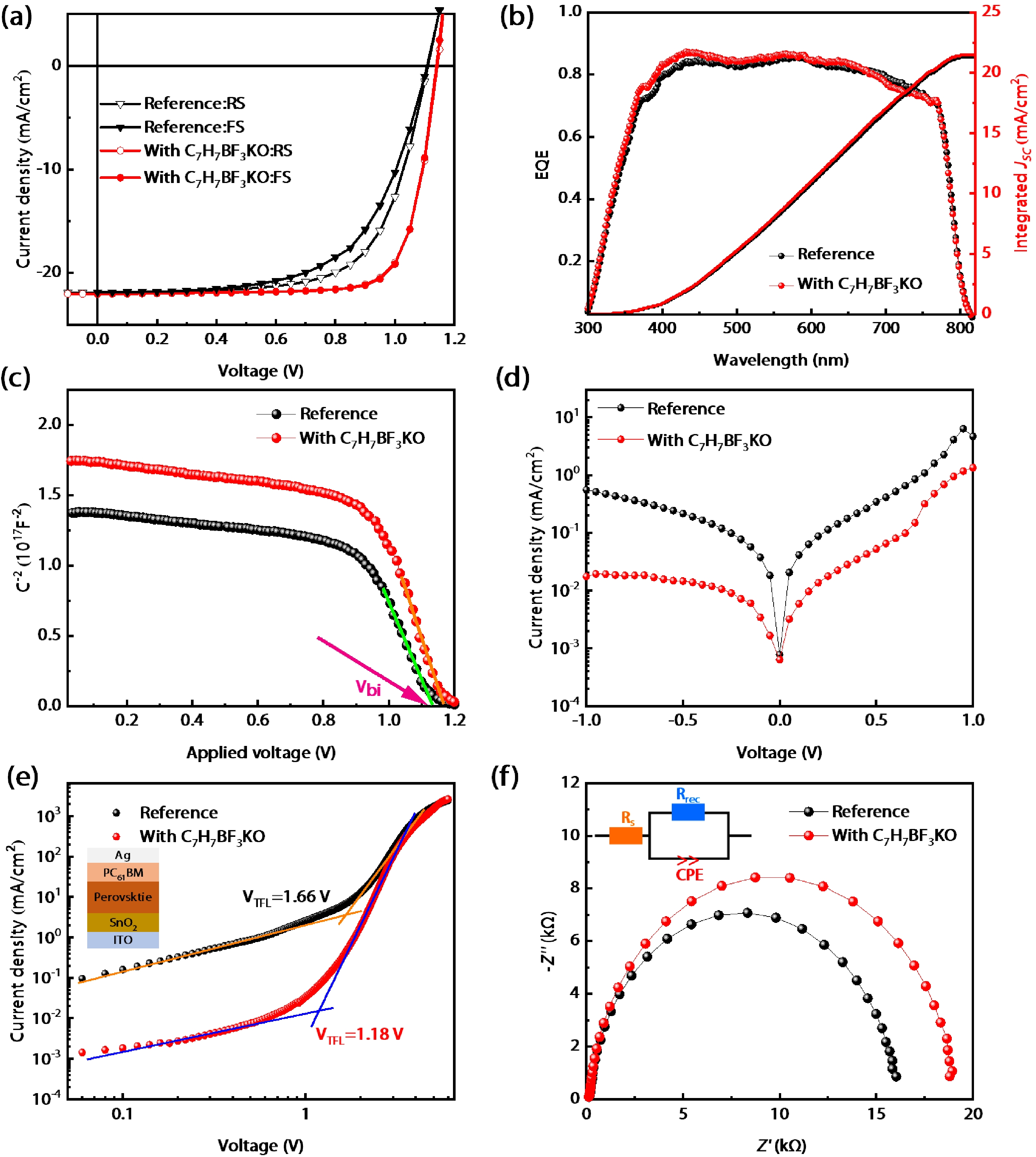 Table 3. The fitting parameters of EIS for reference and C7H7BF3KO-based spray-coated perovskite devices.