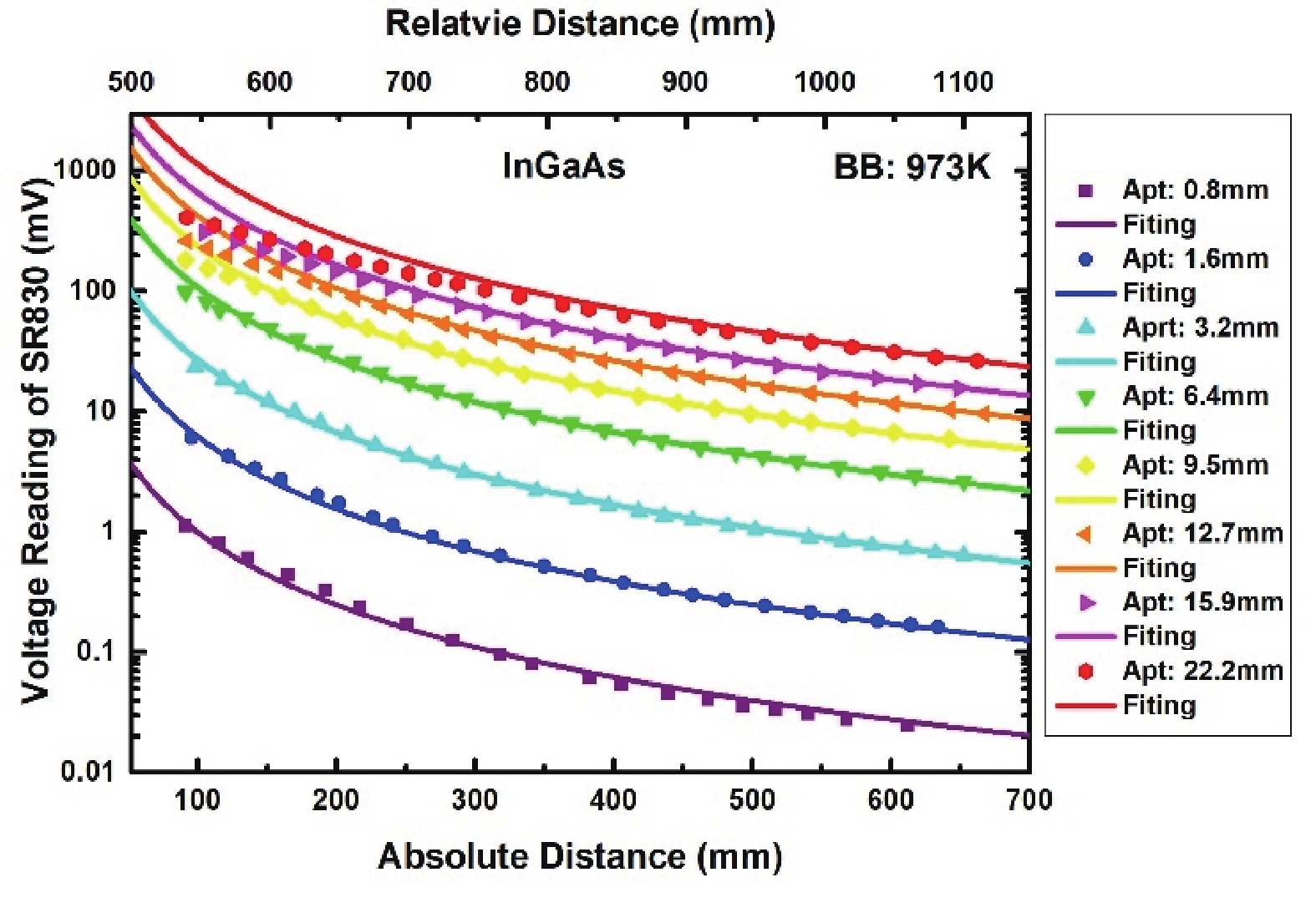 Abstract: For the measurement of responsivity of an infrared photodetector, the most-used radiation source is a blackbody. In such a measurement system, distance between the blackbody, the photodetector and the aperture diameter are two parameters that contribute most measurement errors. In this work, we describe the configuration of our responsivity measurement system in great detail and present a method to calibrate the distance and aperture diameter. The core of this calibration method is to transfer direct measurements of these two parameters into an extraction procedure by fitting the experiment data to the calculated results. The calibration method is proved experimentally with a commercially extended InGaAs detector at a wide range of blackbody temperature, aperture diameter and distance. Then proof procedures are further extended into a detector fabricated in our laboratory and consistent results were obtained.