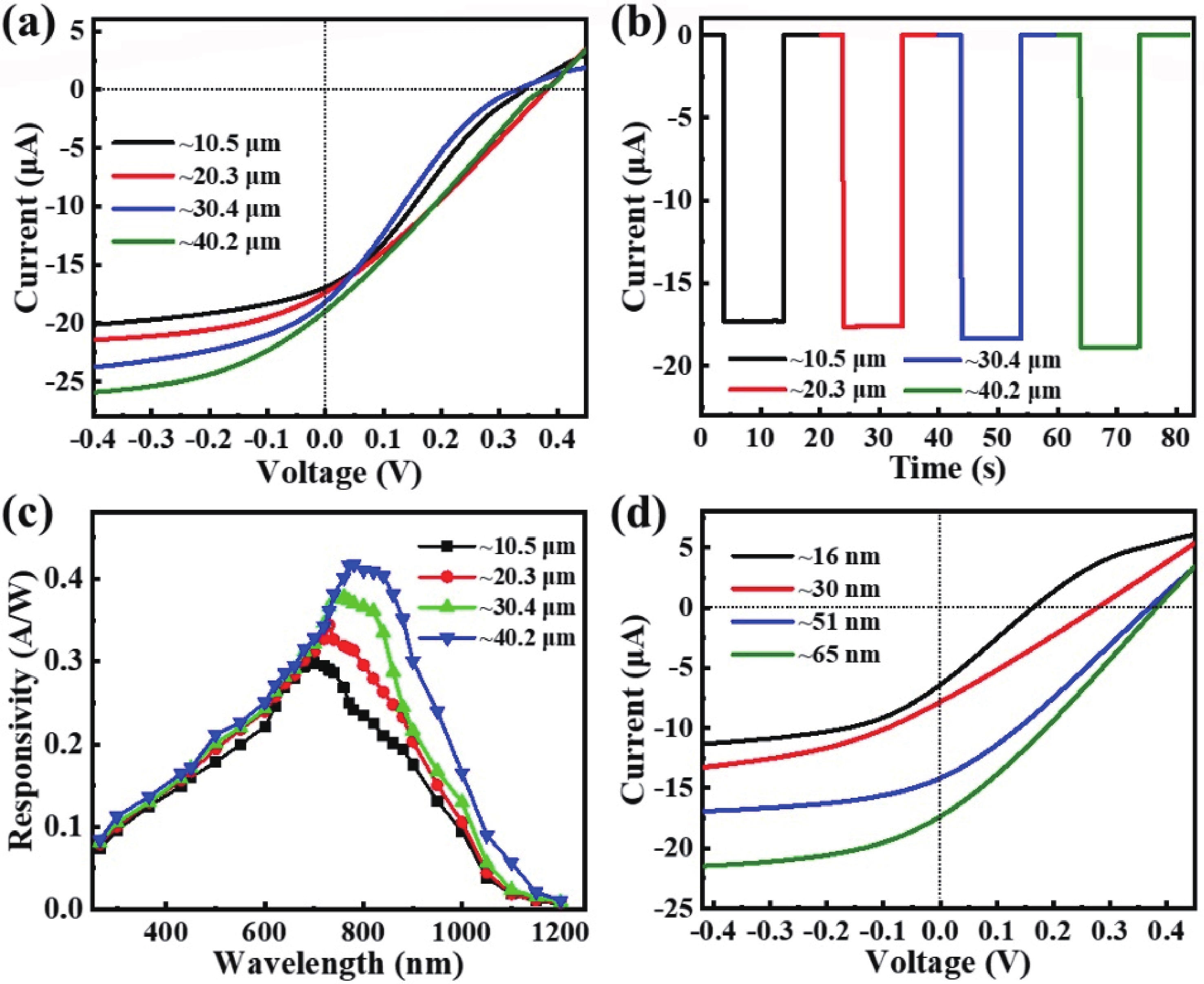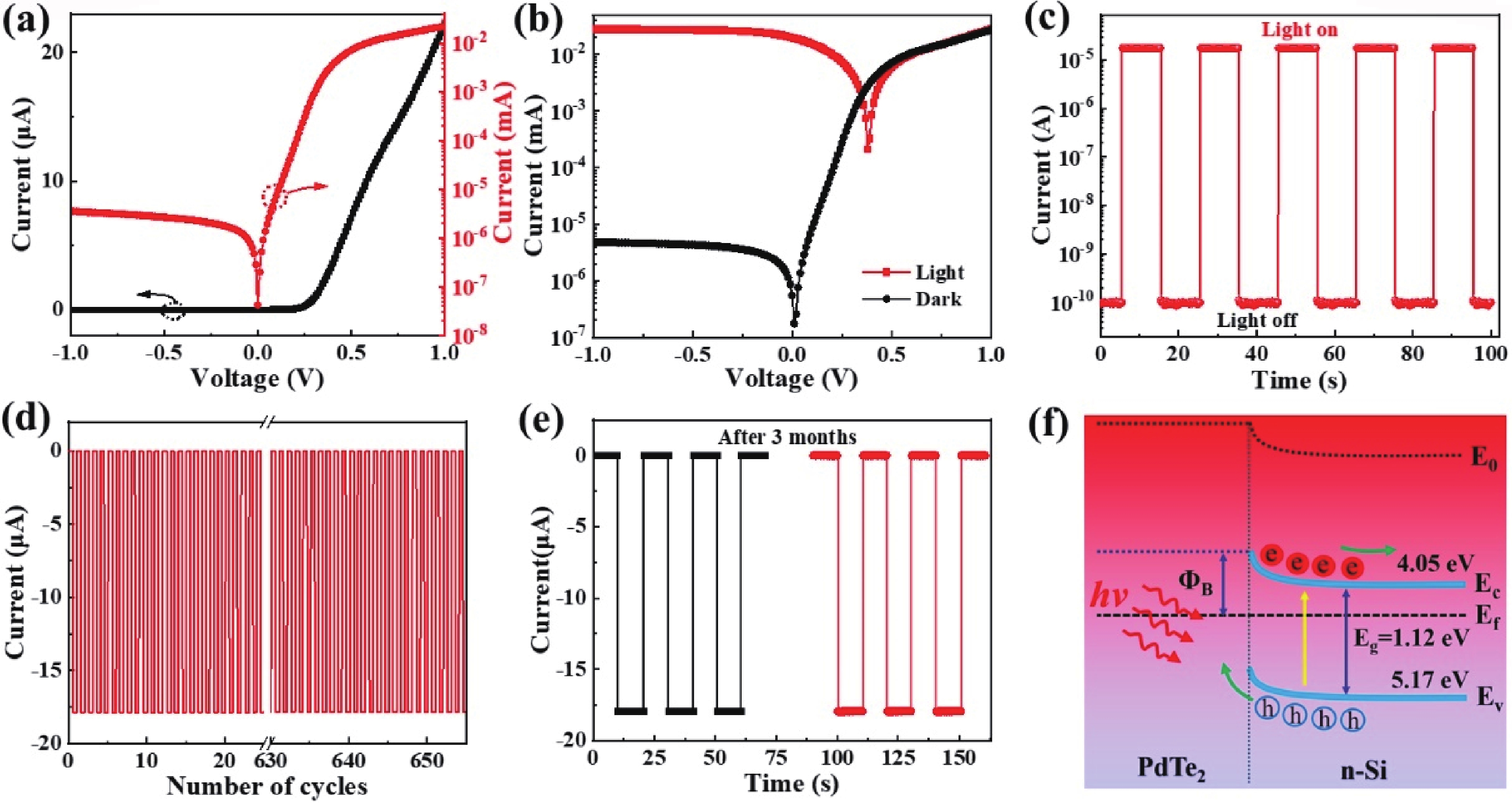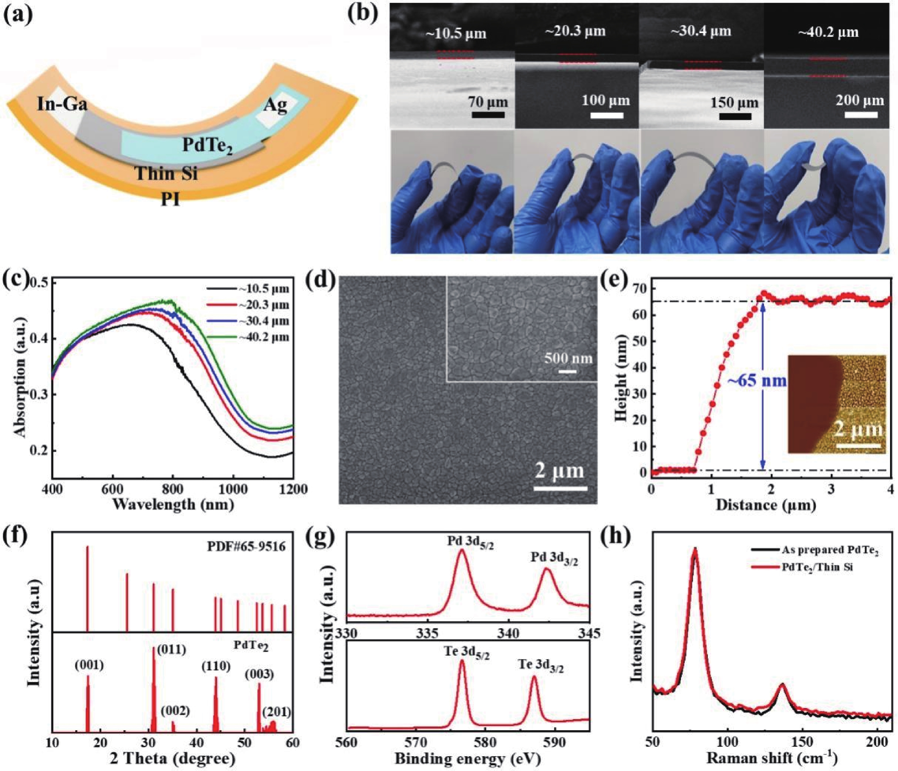 Abstract: Two-dimensional layered material/semiconductor heterostructures have emerged as a category of fascinating architectures for developing highly efficient and low-cost photodetection devices. Herein, we present the construction of a highly efficient flexible light detector operating in the visible-near infrared wavelength regime by integrating a PdTe2 multilayer on a thin Si film. A representative device achieves a good photoresponse performance at zero bias including a sizeable current on/off ratio exceeding 105, a decent responsivity of ~343 mA/W, a respectable specific detectivity of ~2.56 × 1012 Jones, and a rapid response time of 4.5/379 μs, under 730 nm light irradiation. The detector also displays an outstanding long-term air stability and operational durability. In addition, thanks to the excellent flexibility, the device can retain its prominent photodetection performance at various bending radii of curvature and upon hundreds of bending tests. Furthermore, the large responsivity and rapid response speed endow the photodetector with the ability to accurately probe heart rate, suggesting a possible application in the area of flexible and wearable health monitoring.
