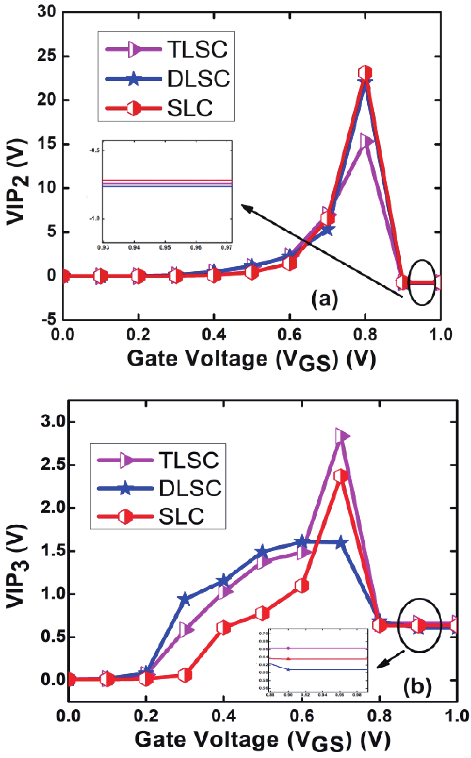 Abstract: This manuscript explores the behavior of a junctionless tri-gate FinFET at the nano-scale region using SiGe material for the channel. For the analysis, three different channel structures are used: (a) tri-layer stack channel (TLSC) (Si–SiGe–Si), (b) double layer stack channel (DLSC) (SiGe–Si), (c) single layer channel (SLC) (Si). The I?V characteristics, subthreshold swing (SS), drain-induced barrier lowering (DIBL), threshold voltage (Vt), drain current (ION), OFF current (IOFF), and ON-OFF current ratio (ION/IOFF) are observed for the structures at a 20 nm gate length. It is seen that TLSC provides 21.3% and 14.3% more ON current than DLSC and SLC, respectively. The paper also explores the analog and RF factors such as input transconductance (gm), output transconductance (gds), gain (gm/gds), transconductance generation factor (TGF), cut-off frequency (fT), maximum oscillation frequency (fmax), gain frequency product (GFP) and linearity performance parameters such as second and third-order harmonics (gm2, gm3), voltage intercept points (VIP2, VIP3) and 1-dB compression points for the three structures. The results show that the TLSC has a high analog performance due to more gm and provides 16.3%, 48.4% more gain than SLC and DLSC, respectively and it also provides better linearity. All the results are obtained using the VisualTCAD tool.