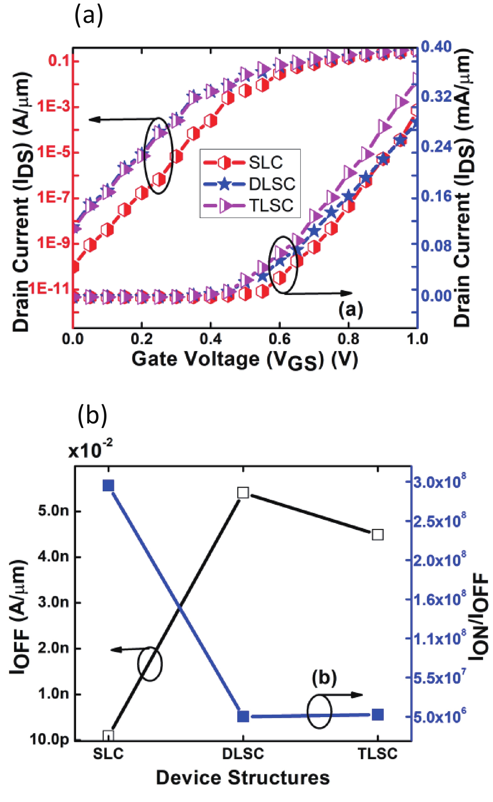 Table 2. Summary of parameters of three junctionless structures in terms of ION, IOFF, ION/IOFF, SS, DIBL and Vt.