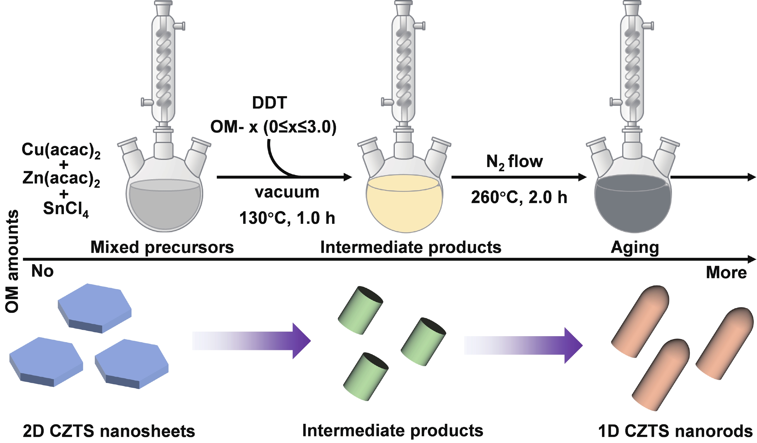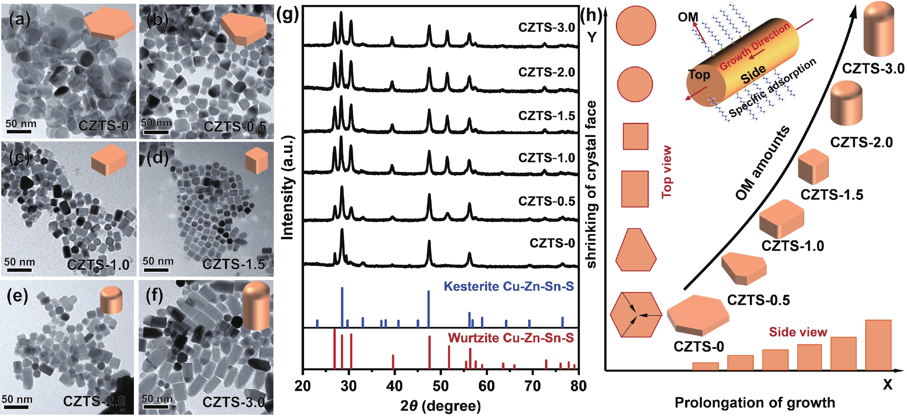 Abstract: As typical quarternary copper-based chalcogenides, Cu–Zn–Sn–S nanocrystals (CZTS NCs) have emerged as a new-fashioned electrocatalyst in hydrogen evolution reactions (HERs). Oleylamine (OM), a reducing surfactant and solvent, plays a significant role in the assisting synthesis of CZTS NCs due to the ligand effect. Herein, we adopted a facile one-pot colloidal method for achieving the structure evolution of CZTS NCs from 2D nanosheets to 1D nanorods assisted through the continuous addition of OM. During the process, the mechanism of OM-induced morphology evolution was further discussed. When merely adding pure 1-dodecanethiol (DDT) as the solvent, the CZTS nanosheets were obtained. As OM was gradually added to the reaction, the CZTS NCs began to grow along the sides of the nanosheets and gradually shrink at the top, followed by the formation of stable nanorods. In acidic electrolytic conditions, the CZTS NCs with 1.0 OM addition display the optimal HER activity with a low overpotential of 561 mV at 10 mA/cm2 and a small Tafel slope of 157.6 mV/dec compared with other CZTS samples. The enhancement of HER activity could be attributed to the contribution of the synergistic effect of the diverse crystal facets to the reaction.