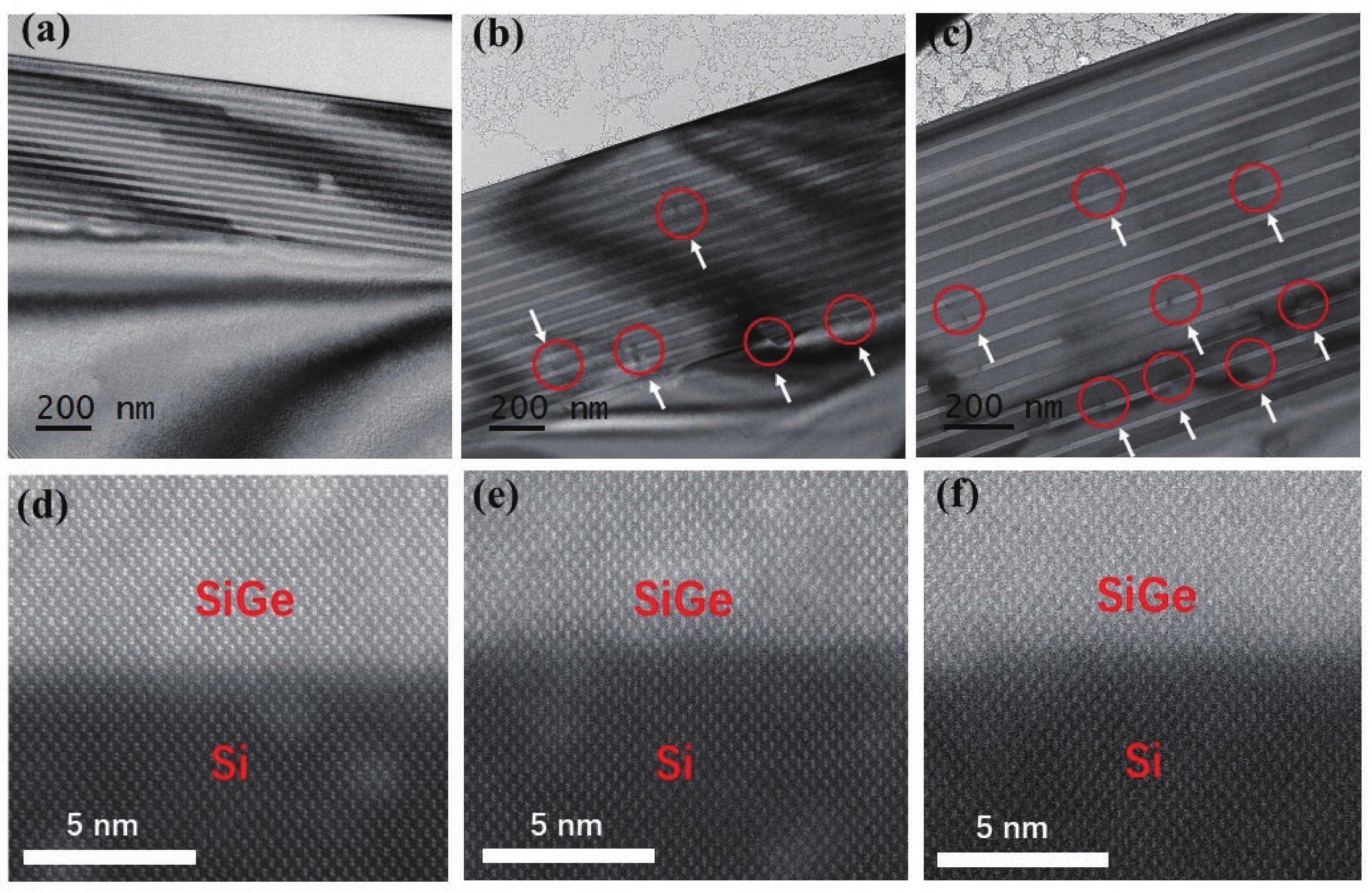 Abstract: Fifteen periods of Si/Si0.7Ge0.3 multilayers (MLs) with various SiGe thicknesses are grown on a 200 mm Si substrate using reduced pressure chemical vapor deposition (RPCVD). Several methods were utilized to characterize and analyze the ML structures. The high resolution transmission electron microscopy (HRTEM) results show that the ML structure with 20 nm Si0.7Ge0.3 features the best crystal quality and no defects are observed. Stacked Si0.7Ge0.3 ML structures etched by three different methods were carried out and compared, and the results show that they have different selectivities and morphologies. In this work, the fabrication process influences on Si/SiGe MLs are studied and there are no significant effects on the Si layers, which are the channels in lateral gate all around field effect transistor (L-GAAFET) devices. For vertically-stacked dynamic random access memory (VS-DRAM), it is necessary to consider the dislocation caused by strain accumulation and stress release after the number of stacked layers exceeds the critical thickness. These results pave the way for the manufacture of high-performance multivertical-stacked Si nanowires, nanosheet L-GAAFETs, and DRAM devices.