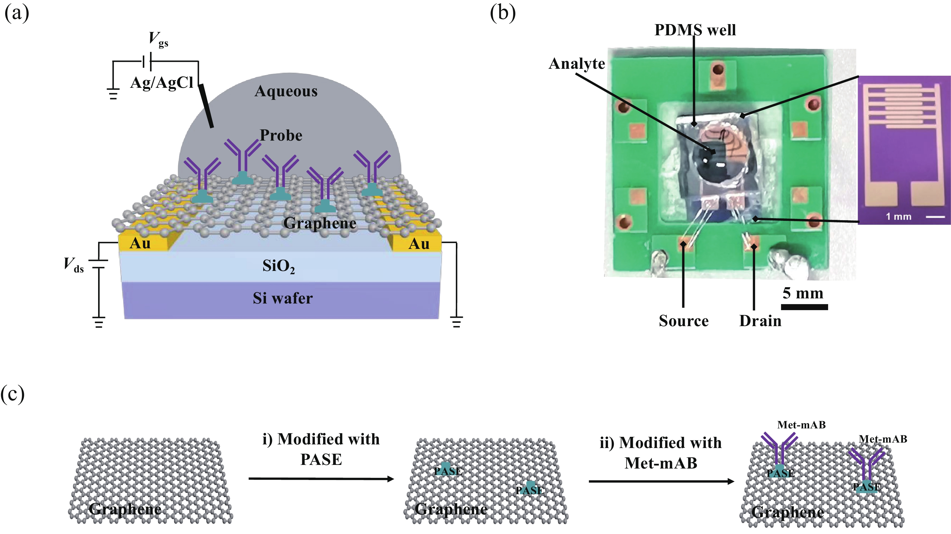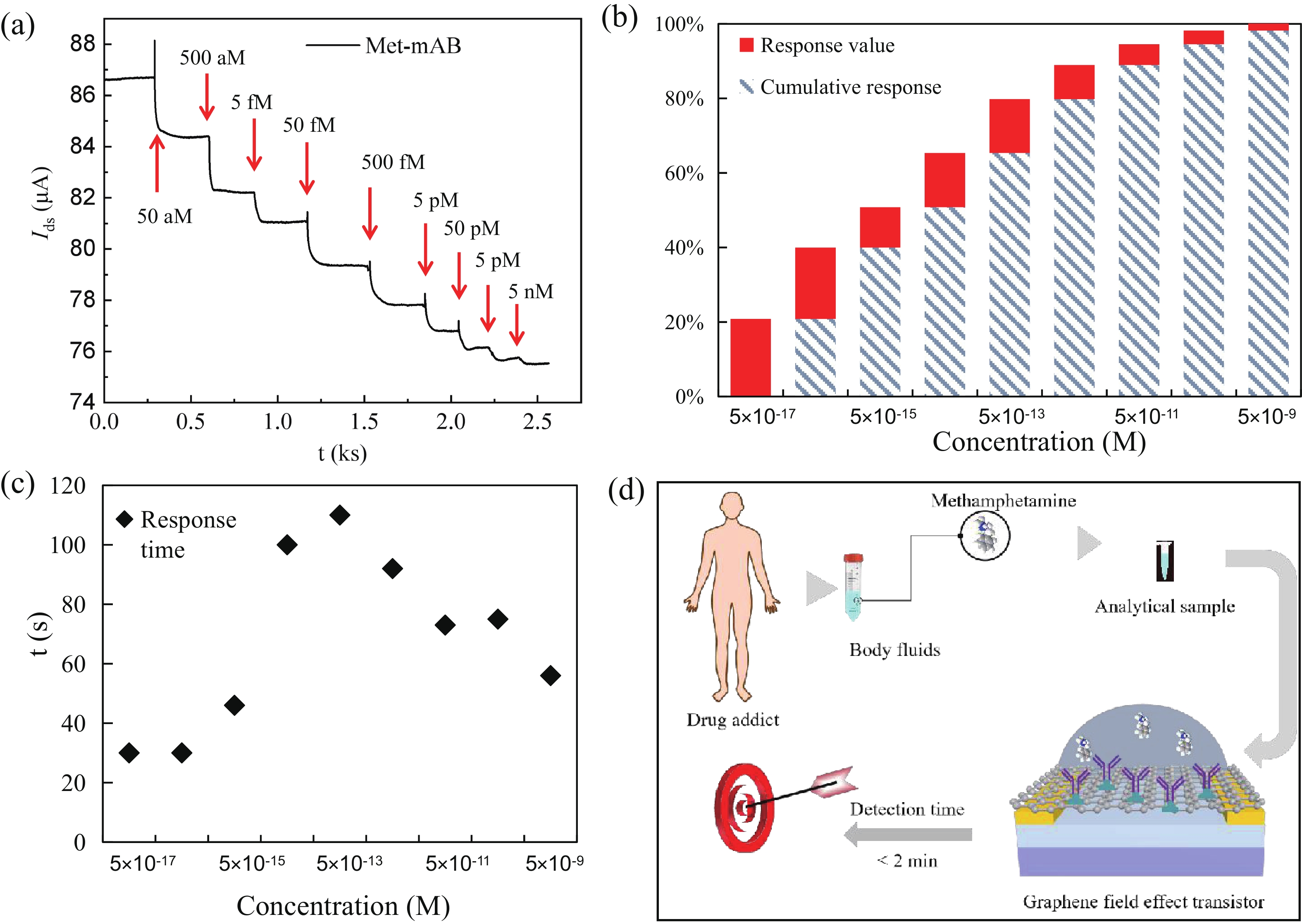 Abstract: Effective detection of methamphetamine (Met) requires a fast, sensitive, and cheap testing assay. However, commercially available methods require expensive instruments and highly trained operators, which are time-consuming and labor-intensive. Herein, an antibody-modified graphene transistor assay is developed for sensitive and minute-level detection of Met in complex environments. The anti-Met probe captured charged targets within 120 s, leading to a p-doping effect near the graphene channel. The limit of detection reaches 50 aM (5.0 × 10?17 M) Met in solution. The graphene transistor would be a valuable tool for Met detection effective prevention of drug abuse.