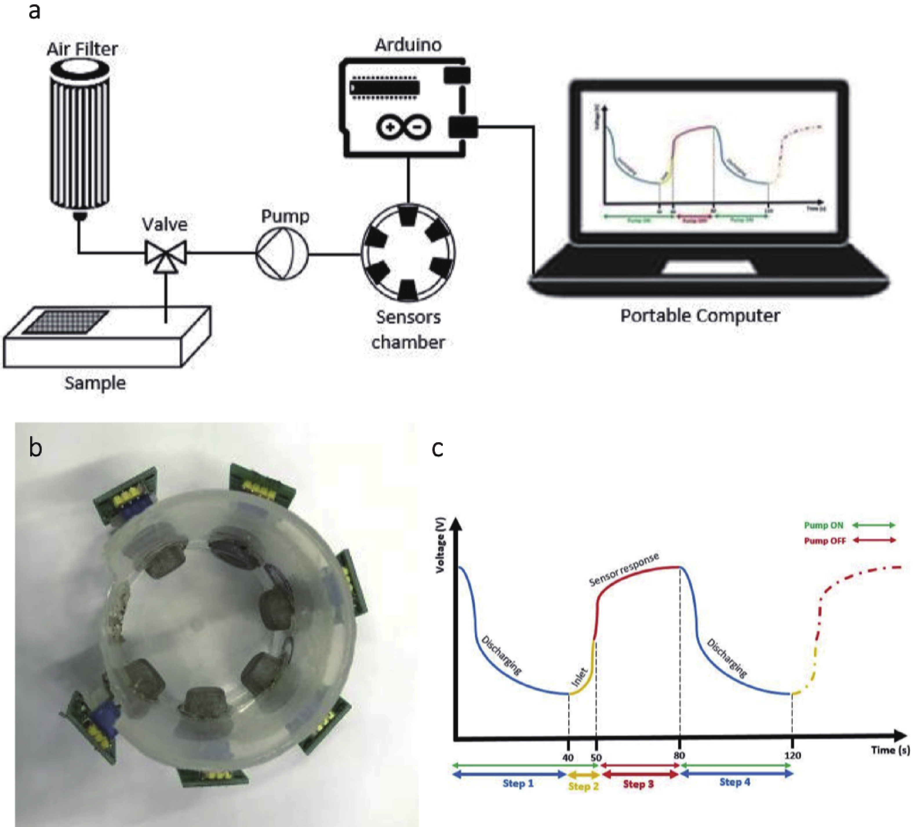 Fig. 2.  (Color online) (a) A schematic view of the electronic nose system. (b) Cylindrical sensor chamber with 6 metal–oxide–semiconductor sensors. (c) System procedure diagram with pump flow work that will control the sensor response in a specific cycle[31].