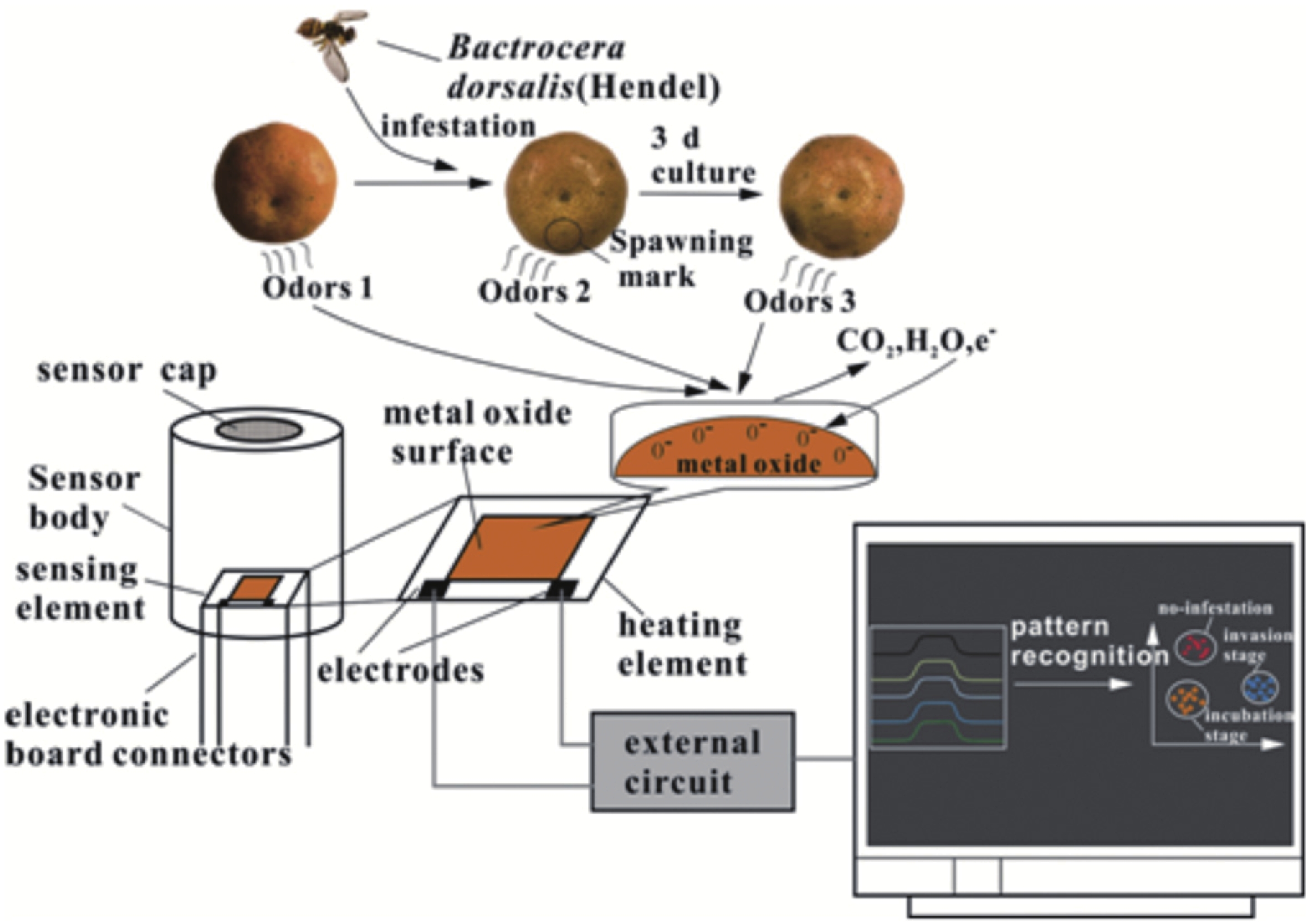 Fig. 3.  (Color online) The principle of the e-nose detection for citrus fruits infested by B. dorsalis[39].