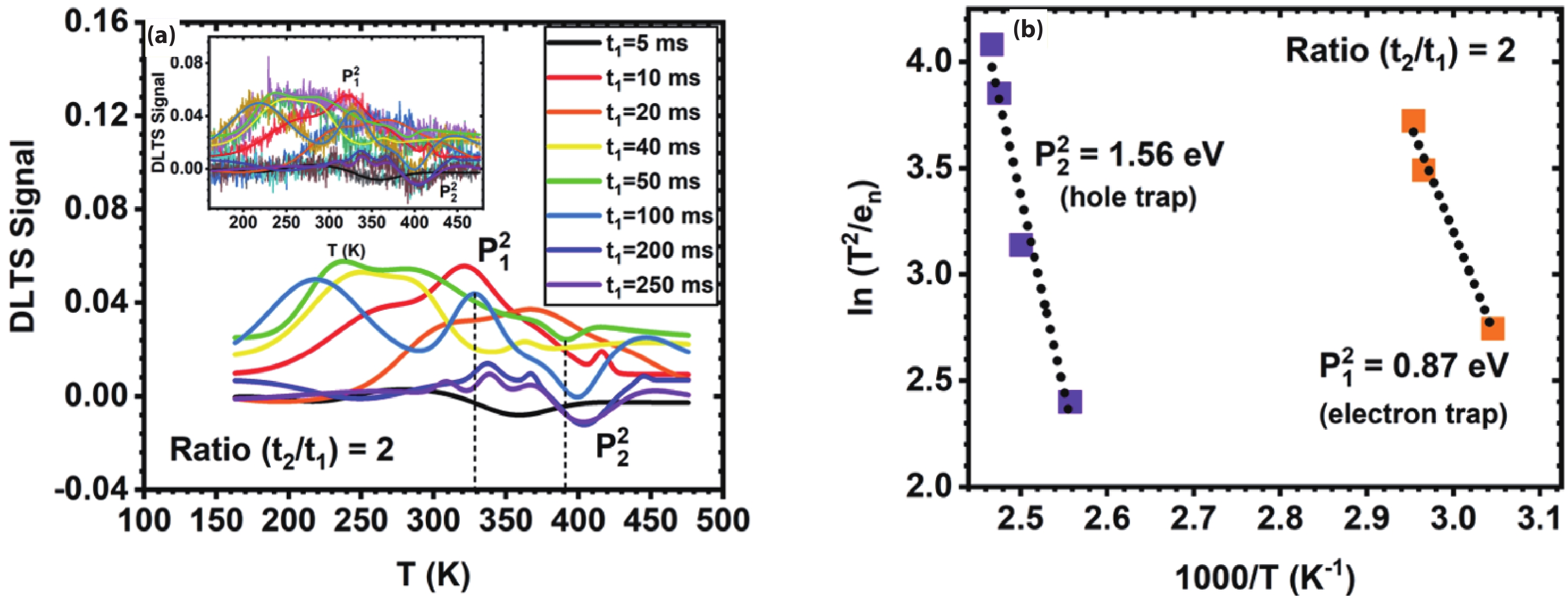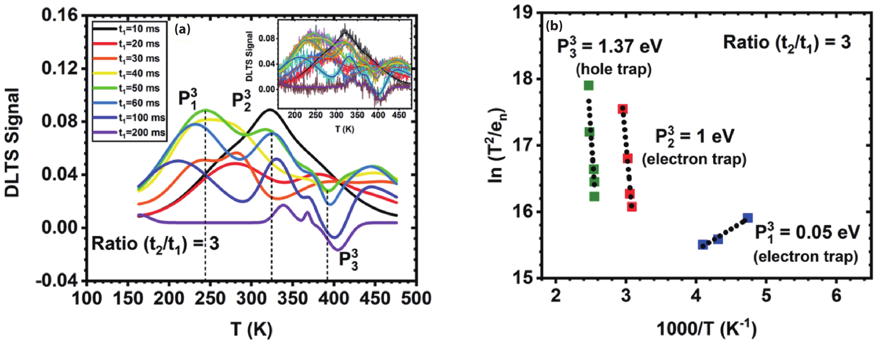 Table 1. Summary of the electron and hole traps from the DLTS experimentation. Ea is the activation energy of the trap measured from the conduction (EC) or valence band (wV) edge, and NT is the trap density as calculated from the Arrhenius plots.