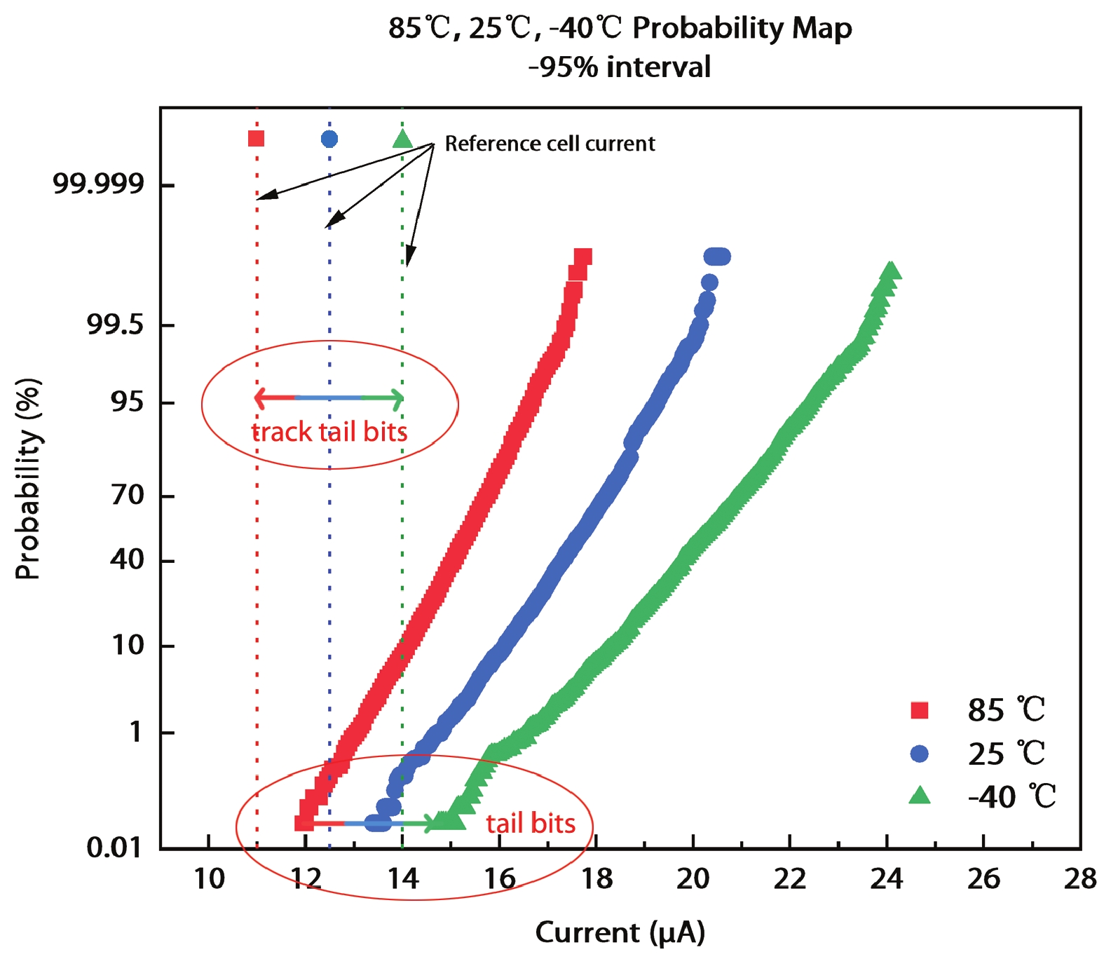 Abstract: The temperature characteristics of the read current of the NOR embedded flash memory with a 1.5T-per-cell structure are theoretically analyzed and experimentally verified. We verify that for a cell programmed with a “10” state, the read current is either increasing, decreasing, or invariable with the temperature, essentially depending on the reading overdrive voltage of the selected bitcell, or its programming strength. By precisely controlling the programming strength and thus manipulating its temperature coefficient, we propose a new setting method for the reference cells that programs each of reference cells to a charge state with a temperature coefficient closely tracking tail data cells, thereby solving the current coefficient mismatch and improving the read window.