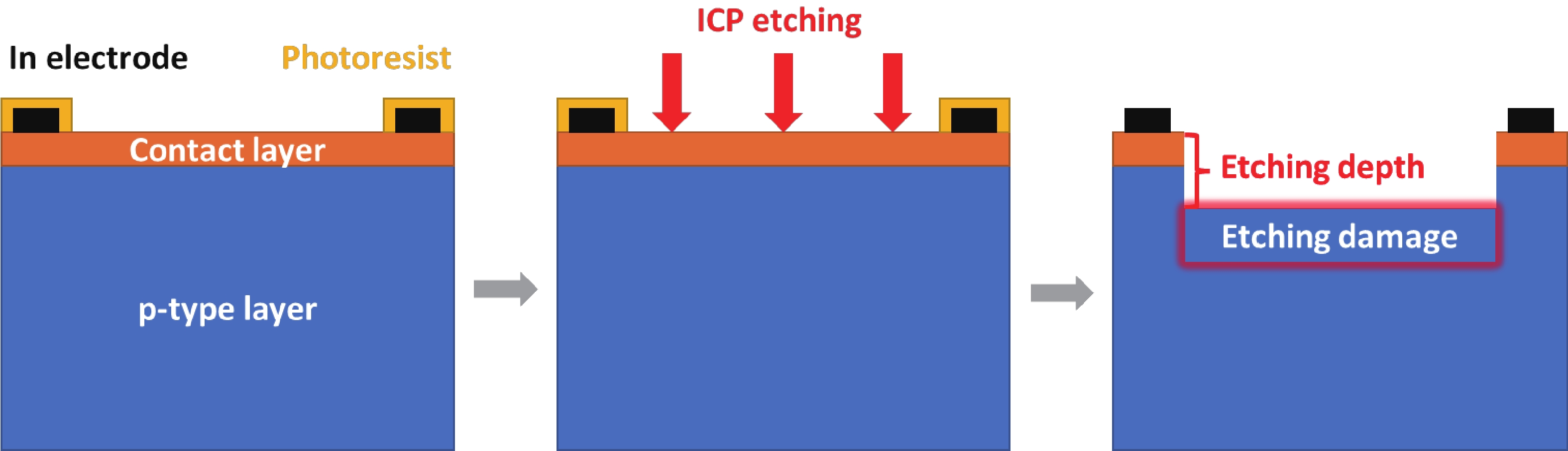 Fig. 3.  (Color online) Schematic of step etching experiment, etching damage is also considered.