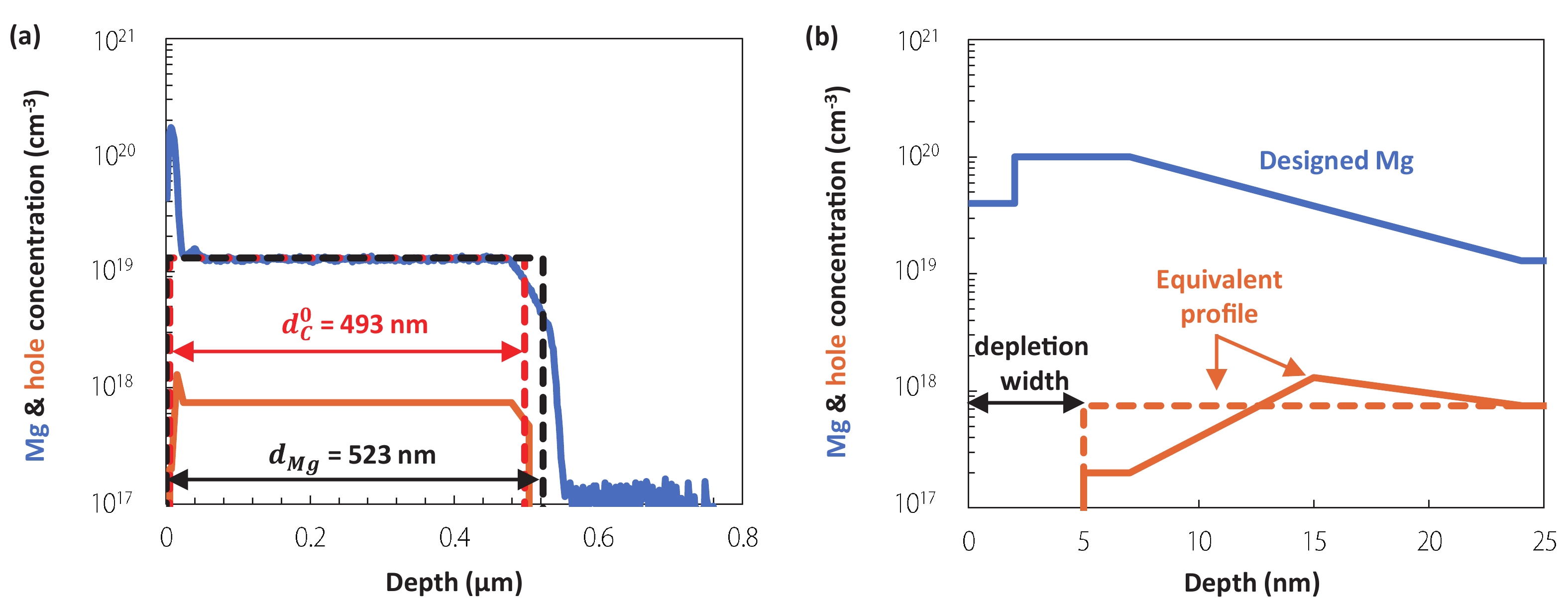 Fig. 5.  (Color online) (a) Measured Mg & hole concentration for p-AlGaN/GaN SLs sample. The red broken line shows the equivalent doping profile used in the Hall measurements. (b) Analyzed Mg & hole concentration near the surface region for the same sample. The orange broken line shows the equivalent hole profile with a constant density.