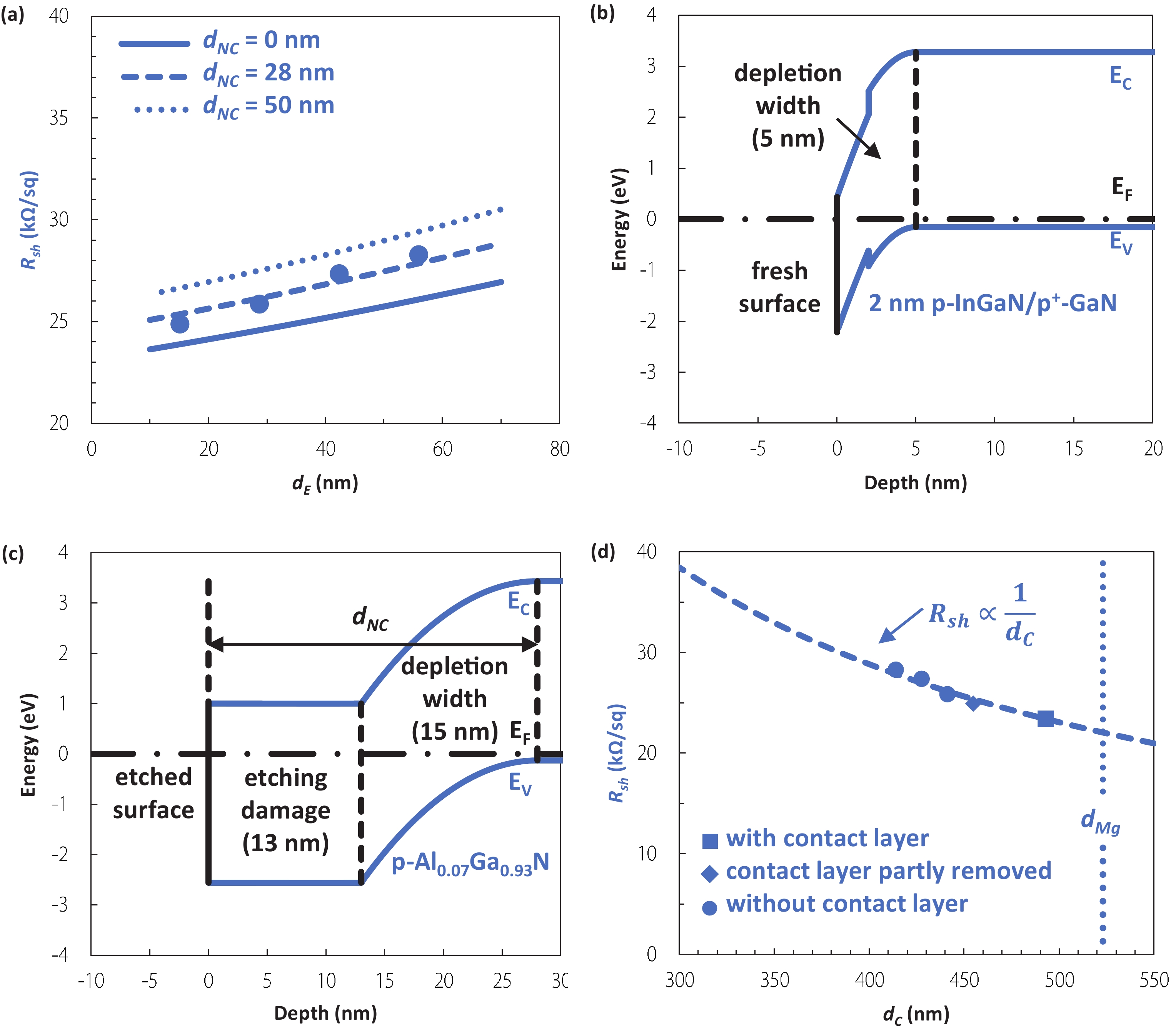 Fig. 6.  (Color online) (a) Fitting of dNC with different dE. (b) Band diagram near the fresh surface. (c) Band diagram near the etched surface when contact layers are completely removed. (d) Measured Rsh plotted against dC.