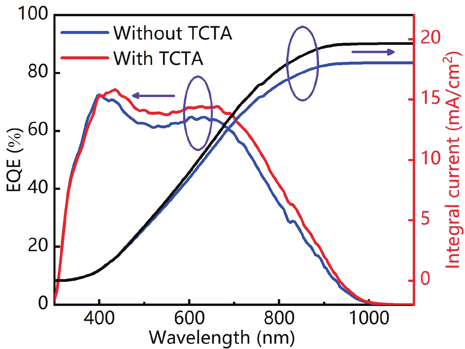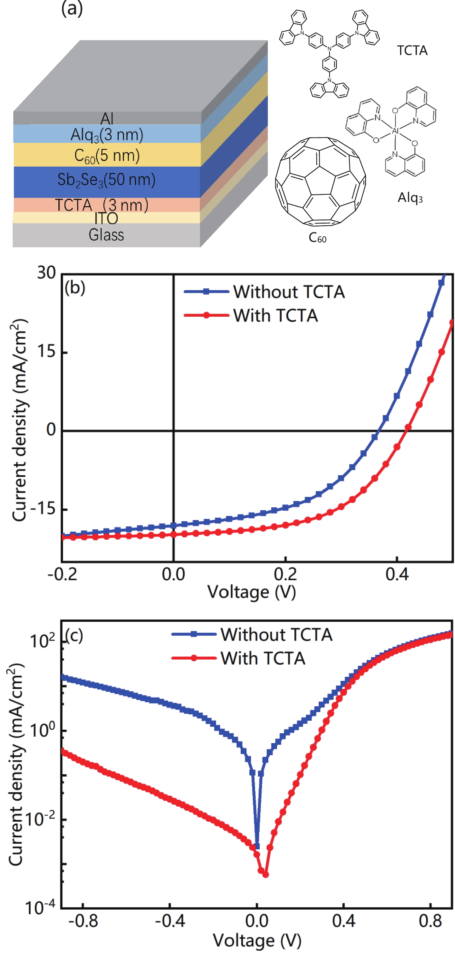 Abstract: Antimony selenide (Sb2Se3) is an emerging solar cell material. Here, we demonstrate that an organic small molecule of 4, 4', 4''-tris(carbazol-9-yl)-triphenylamine (TCTA) can efficiently passivate the anode interface of the Sb2Se3 solar cell. We fabricated the device by the vacuum thermal evaporation, and took ITO/TCTA (3.0 nm)/Sb2Se3 (50 nm)/C60 (5.0 nm)/Alq3 (3.0 nm)/Al as the device architecture, where Alq3 is the tris(8-hydroxyquinolinato) aluminum. By introducing a TCTA layer, the open-circuit voltage is raised from 0.36 to 0.42 V, and the power conversion efficiency is significantly improved from 3.2% to 4.3%. The TCTA layer not only inhibits the chemical reaction between the ITO and Sb2Se3 during the annealing process but it also blocks the electron diffusion from Sb2Se3 to ITO anode. The enhanced performance is mainly attributed to the suppression of the charge recombination at the anode interface.