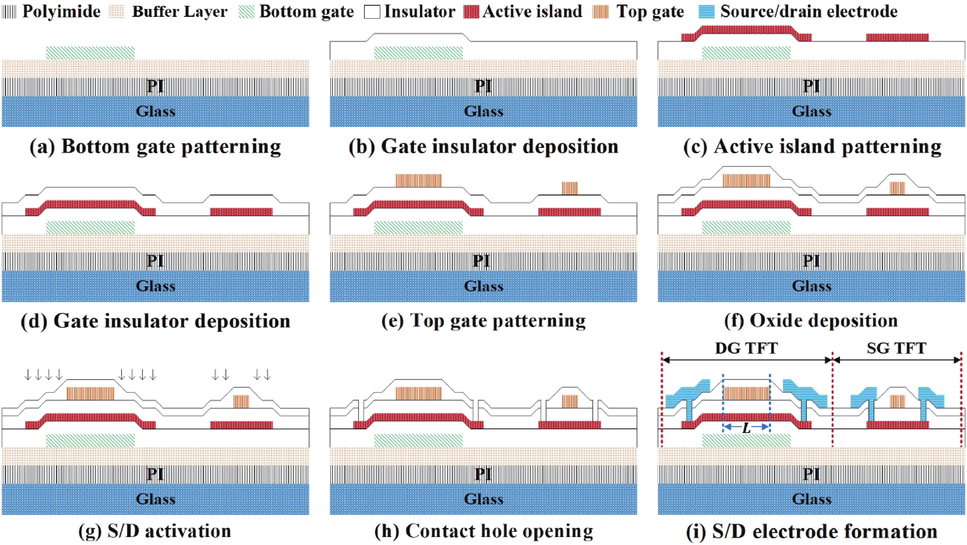 Key words: flexible electronics, metal–oxide semiconductor, thin-film transistor, dual gate, fluorination, analog front-end system, sensors