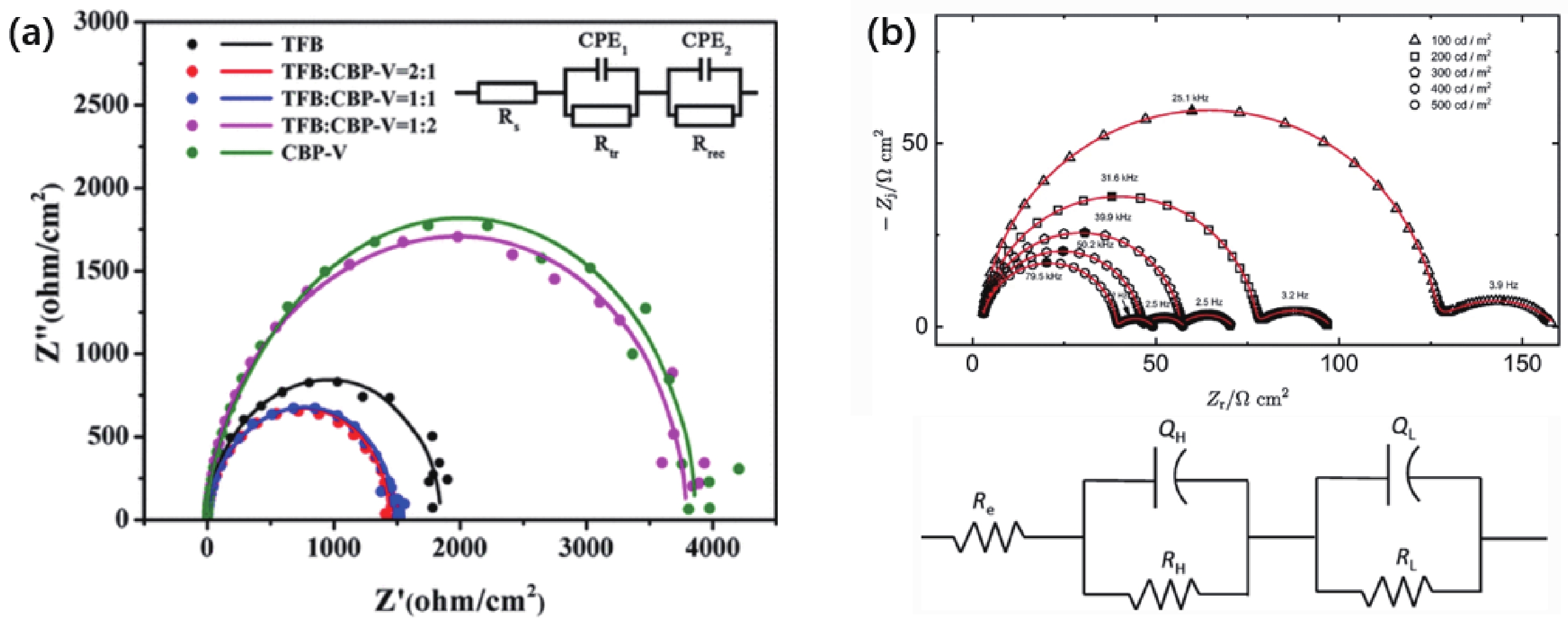 Abstract: Impedance spectroscopy has been increasingly employed in quantum dot light-emitting diodes (QLEDs) to investigate the charge dynamics and device physics. In this review, we introduce the mathematical basics of impedance spectroscopy that applied to QLEDs. In particular, we focus on the Nyquist plot, Mott?Schottky analysis, capacitance-frequency and capacitance-voltage characteristics, and the dC/dV measurement of the QLEDs. These impedance measurements can provide critical information on electrical parameters such as equivalent circuit models, characteristic time constants, charge injection and recombination points, and trap distribution of the QLEDs. However, this paper will also discuss the disadvantages and limitations of these measurements. Fundamentally, this review provides a deeper understanding of the device physics of QLEDs through the application of impedance spectroscopy, offering valuable insights into the analysis of performance loss and degradation mechanisms of QLEDs.