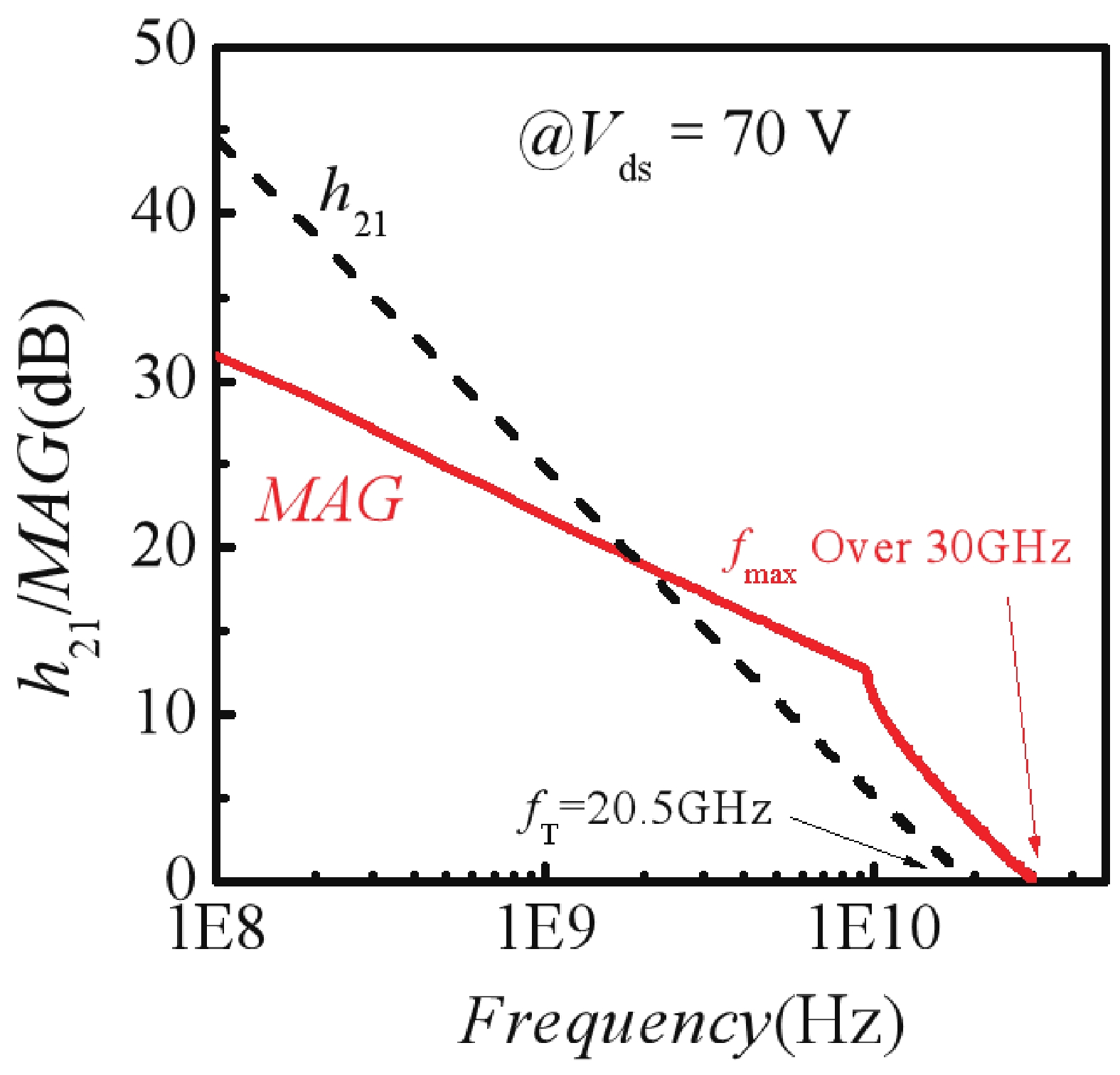 Abstract: In this letter, high power density AlGaN/GaN high electron-mobility transistors (HEMTs) on a freestanding GaN substrate are reported. An asymmetric Γ-shaped 500-nm gate with a field plate of 650 nm is introduced to improve microwave power performance. The breakdown voltage (BV) is increased to more than 200 V for the fabricated device with gate-to-source and gate-to-drain distances of 1.08 and 2.92 μm. A record continuous-wave power density of 11.2 W/mm@10 GHz is realized with a drain bias of 70 V. The maximum oscillation frequency (fmax) and unity current gain cut-off frequency (ft) of the AlGaN/GaN HEMTs exceed 30 and 20 GHz, respectively. The results demonstrate the potential of AlGaN/GaN HEMTs on free-standing GaN substrates for microwave power applications.
