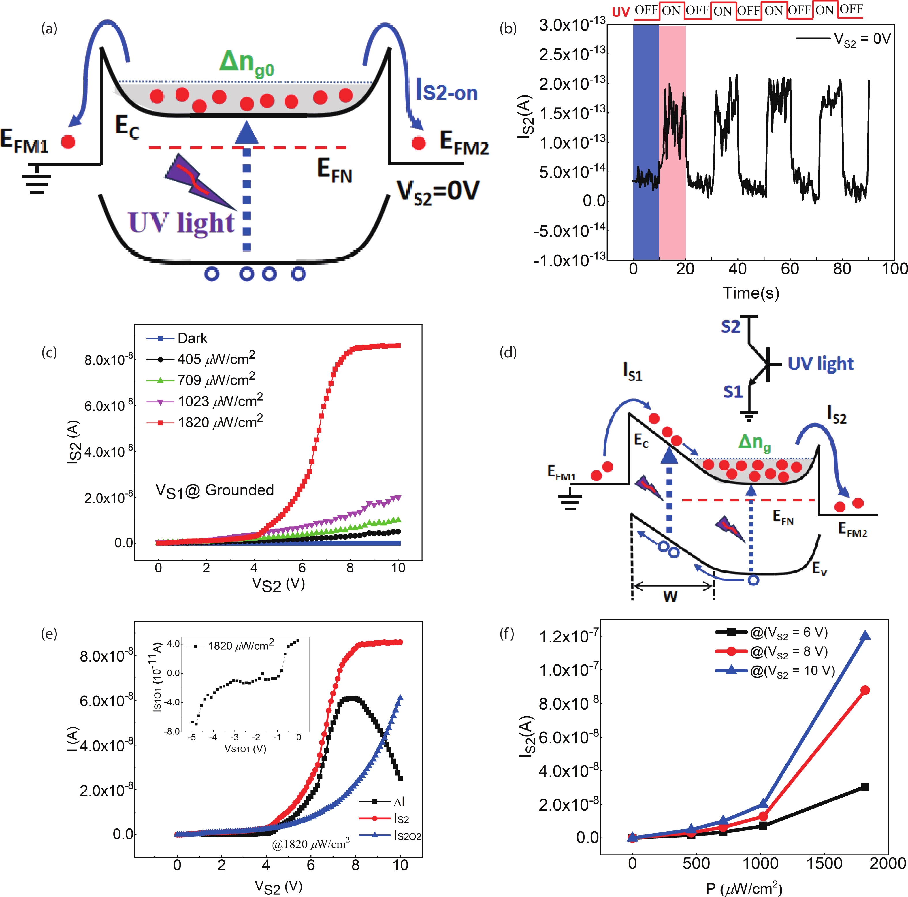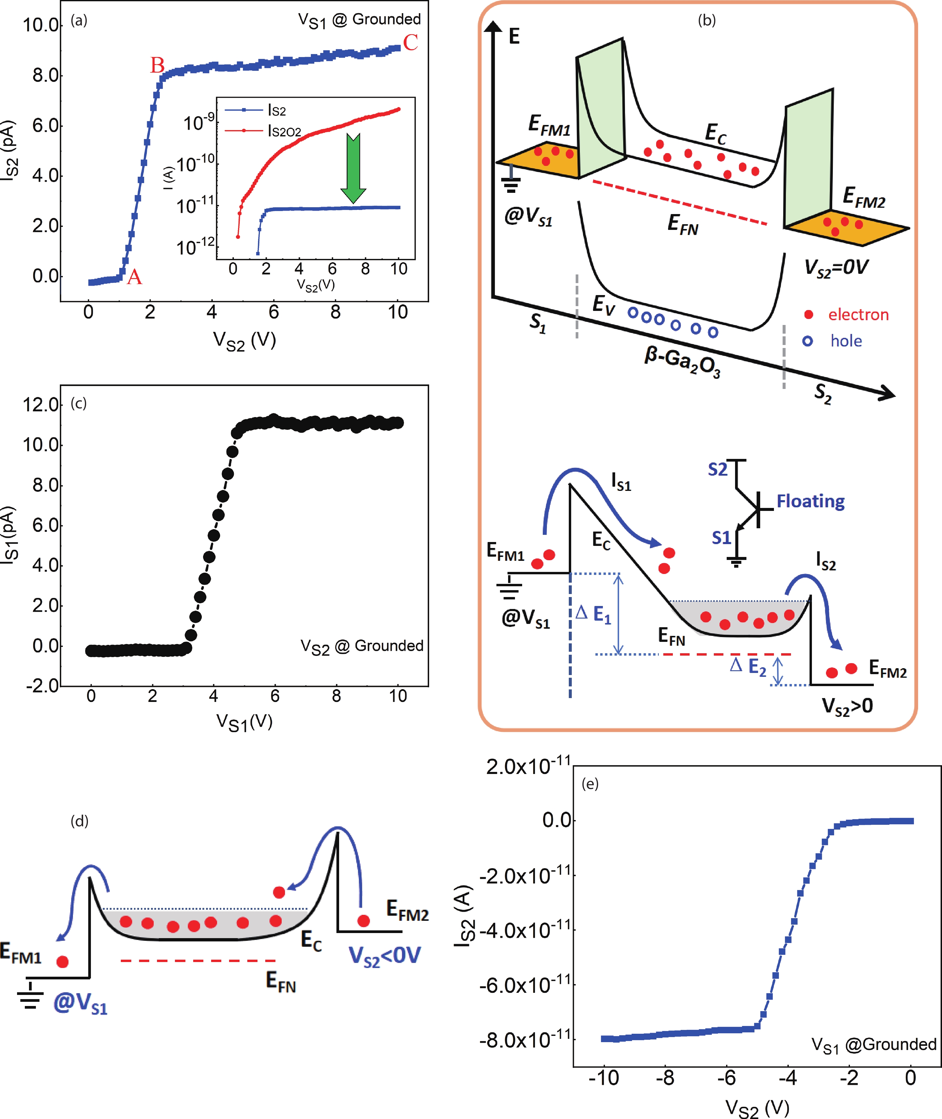 Abstract: High quality β-Ga2O3 single crystal nanobelts with length of 2?3 mm and width from tens of microns to 132 μm were synthesized by carbothermal reduction method. Based on the grown nanobelt with the length of 600 μm, the dual-Schottky-junctions coupling device (DSCD) was fabricated. Due to the electrically floating Ga2O3 nanobelt region coupling with the double Schottky-junctions, the current IS2 increases firstly and rapidly reaches into saturation as increase the voltage VS2. The saturation current is about 10 pA, which is two orders of magnitude lower than that of a single Schottky-junction. In the case of solar-blind ultraviolet (UV) light irradiation, the photogenerated electrons further aggravate the coupling physical mechanism in device. IS2 increases as the intensity of UV light increases. Under the UV light of 1820 μW/cm2, IS2 quickly enters the saturation state. At VS2 = 10 V, photo-to-dark current ratio (PDCR) of the device reaches more than 104, the external quantum efficiency (EQE) is 1.6 × 103%, and the detectivity (D*) is 7.5 × 1012 Jones. In addition, the device has a very short rise and decay times of 25?54 ms under different positive and negative bias. DSCD shows unique electrical and optical control characteristics, which will open a new way for the application of nanobelt-based devices.